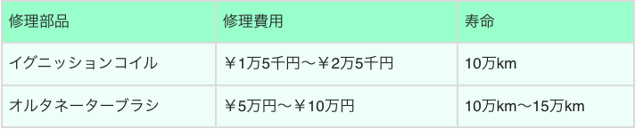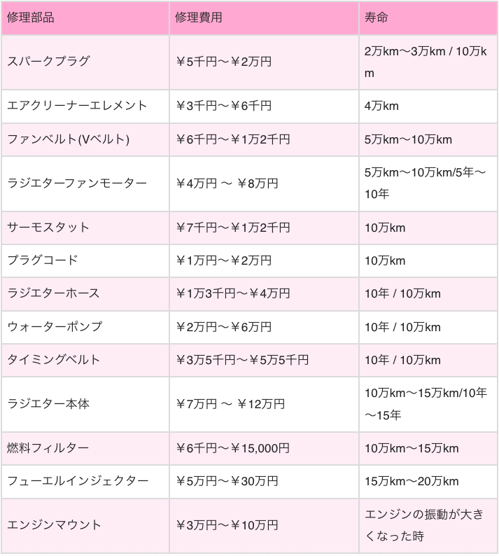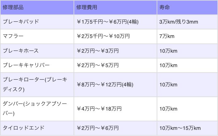 以下は車の修理にかかる費用と部品の寿命 (交換時期) の目安です。