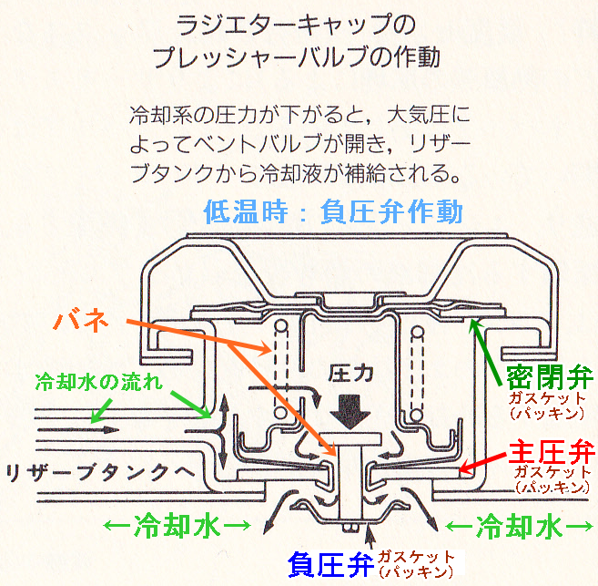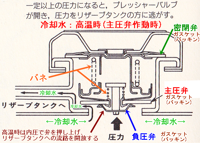 ラジエターキャップの役割りは、密閉弁、加圧弁、負圧弁が機能することで冷却系統の圧力を一定に保つことです。